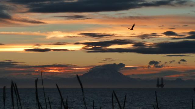 Idyllischer Sonnenuntergang trotz Ölplattform